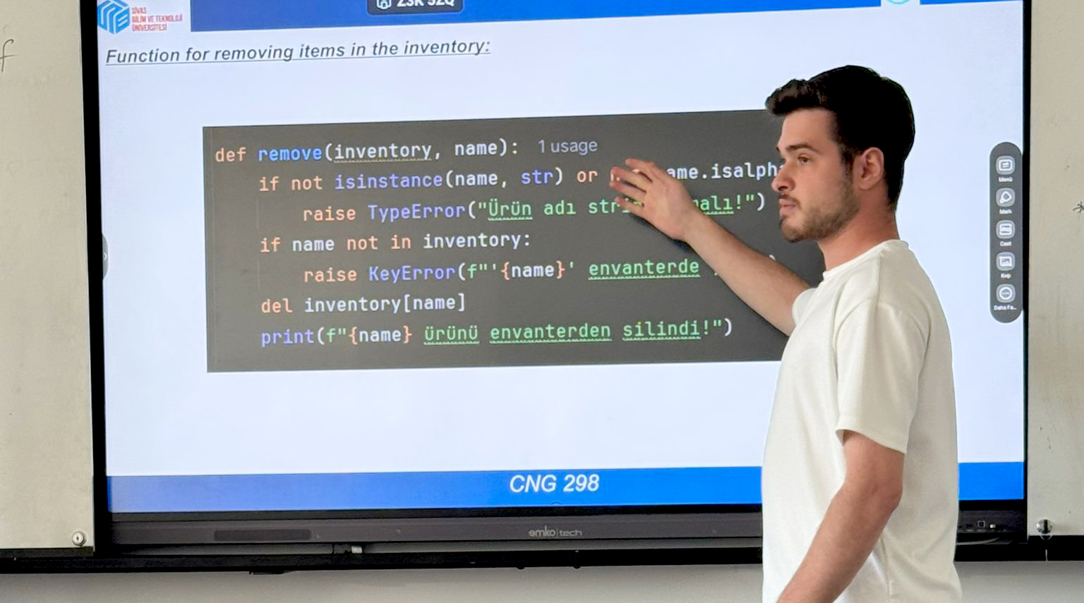 Dersin proje aşamasında, öğrenciler Python programlama diliyle mühendislik problemlerine yönelik özgün projeler geliştirerek sunumlarını gerçekleştirdiler. Bu çalışmalar, öğrencilerin algoritmik düşünme ve yazılım geliştirme becerilerini pekiştirmelerini sağladı.